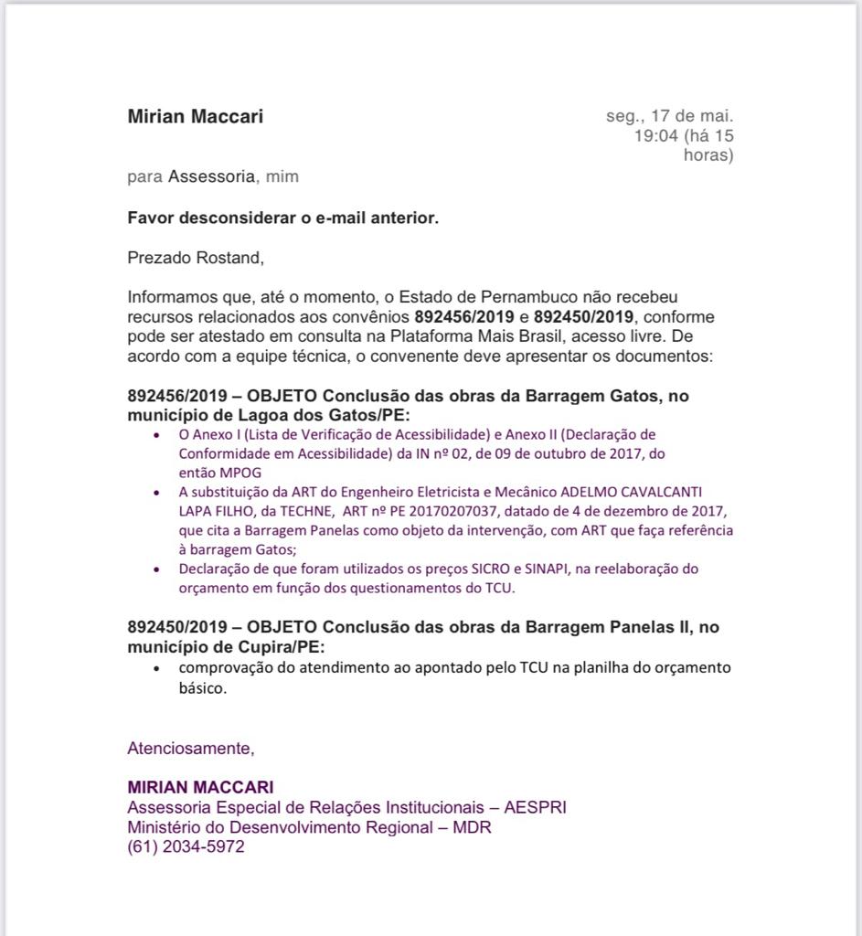Em resposta ao deputado, a Assessoria Especial de Relações Institucionais do Ministério do Desenvolvimento Regional apontou que os recursos estão travados pela falta de entrega de documentações por parte do Governo de Pernambuco. Além disso, o Ministério apontou a falta de comprovação do atendimento aos questionamentos feitos pelo TCU quanto às obras.